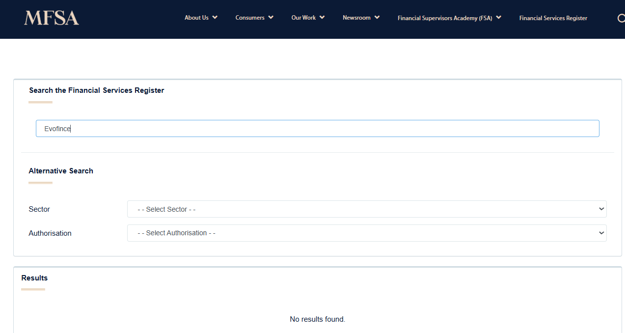 Evofince claims to have a license under MFSA but when searching for them, no results are shown. Which means they lied about being registered under MFSA: https://www.mfsa.mt/financial-services-register/