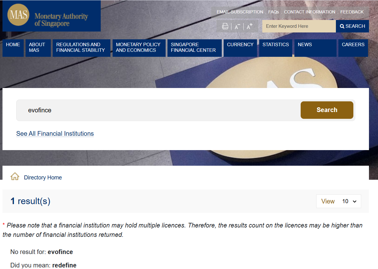 No record of Evofince on Monetary Authority of Singapore(MAS), which Evofince claimed they were registered under: https://eservices.mas.gov.sg/fid/institution?term=evofince