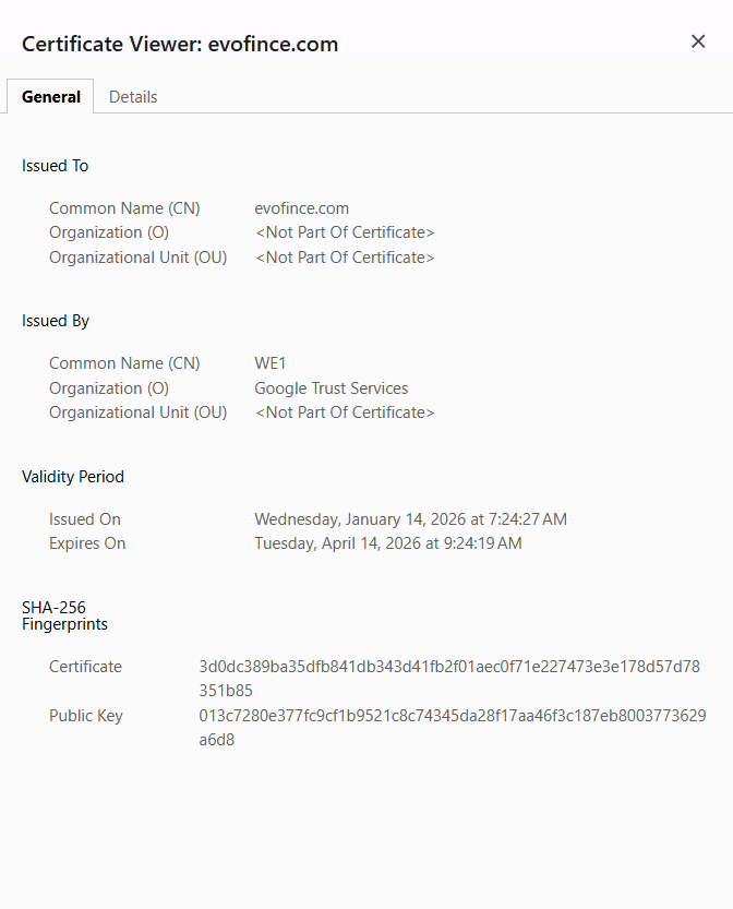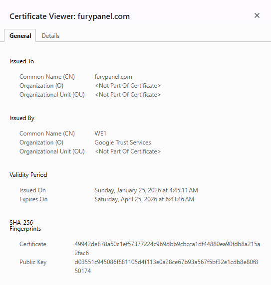 mediumTechnical analysis of the SSL/TLS certificates for both evofince.com and furypanel.com identifies unique SHA-256 fingerprints and Public Keys. These digital signatures indicate a technical relationship between the two domains. Tracking these specific identifiers allows for the identification of other platforms that may be utilizing the same security configuration and infrastructure.