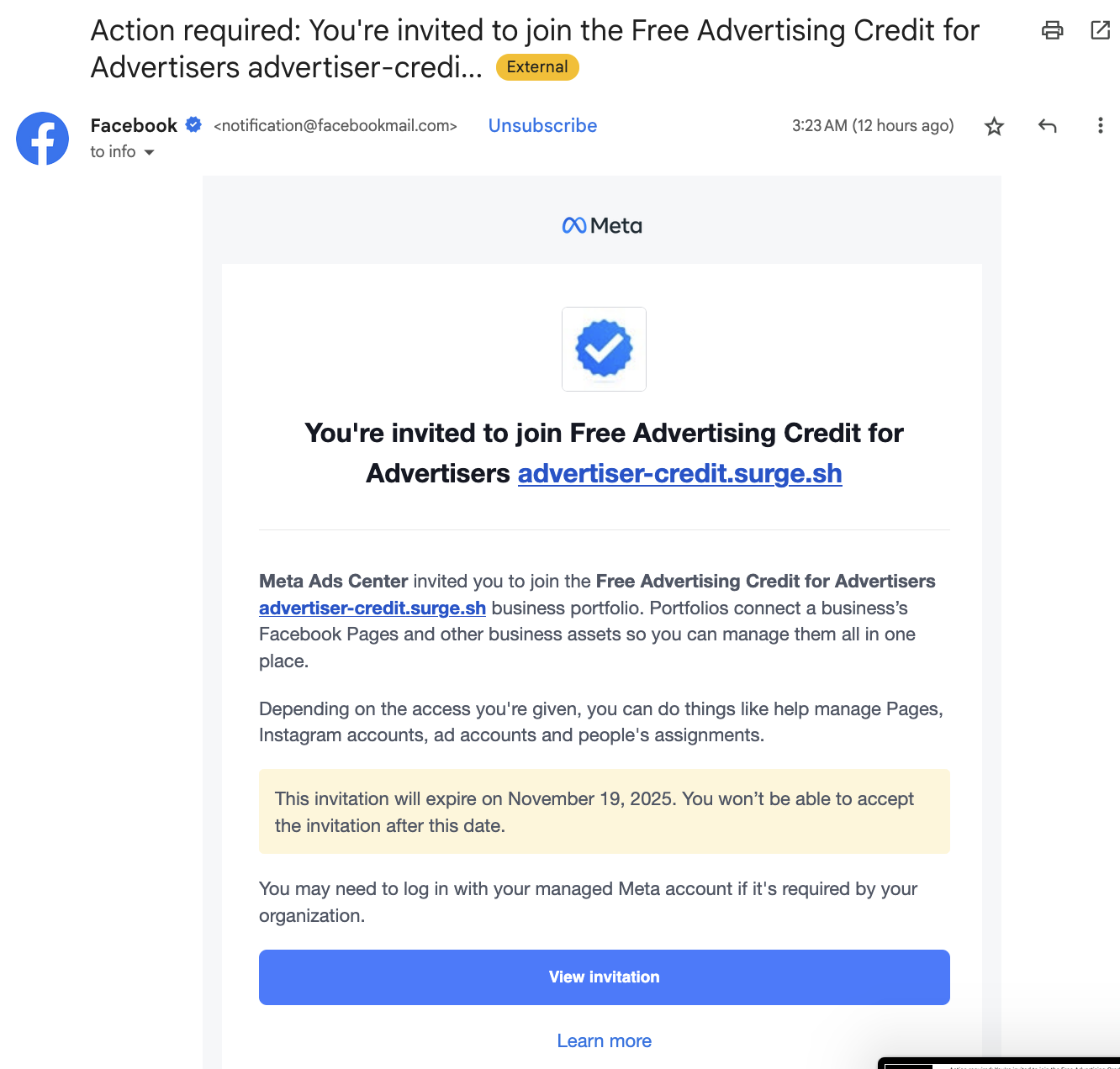 The attackers are disguising phishing links inside legitimate Facebook business notifications, making the messages appear safe and trusted. In some cases, they even entice users by offering free advertising credit to get them to click.