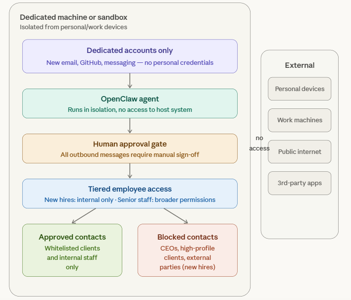 If a company chooses to integrate OpenClaw into their business operations, they could implement the above practices to maintain safety. However, it’s also worth considering that agents should have different levels of permissions depending on who in the organization is using them. For example, a newly-hired employee shouldn’t have access to an agent capable of emailing executives or high-profile clients. Companies can tier access based on role and seniority, restricting who—both internally and externally—the agent can communicate with and what actions it can perform.