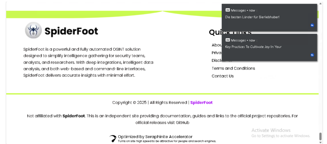 mediumSpiderfoot.org presents itself as an informational and download source for the SpiderFoot OSINT tool, using branding and documentation-style language consistent with the legitimate project. However, during interaction, the homepage displayed advertising banners and browser notification-style popups unrelated to the SpiderFoot tool. While the site visually resembles a technical documentation or distribution page, the presence of advertising infrastructure is inconsistent with standard open-source software hosting practices. This combination of official-style presentation and monetization behavior raises concerns regarding credibility and distribution integrity.