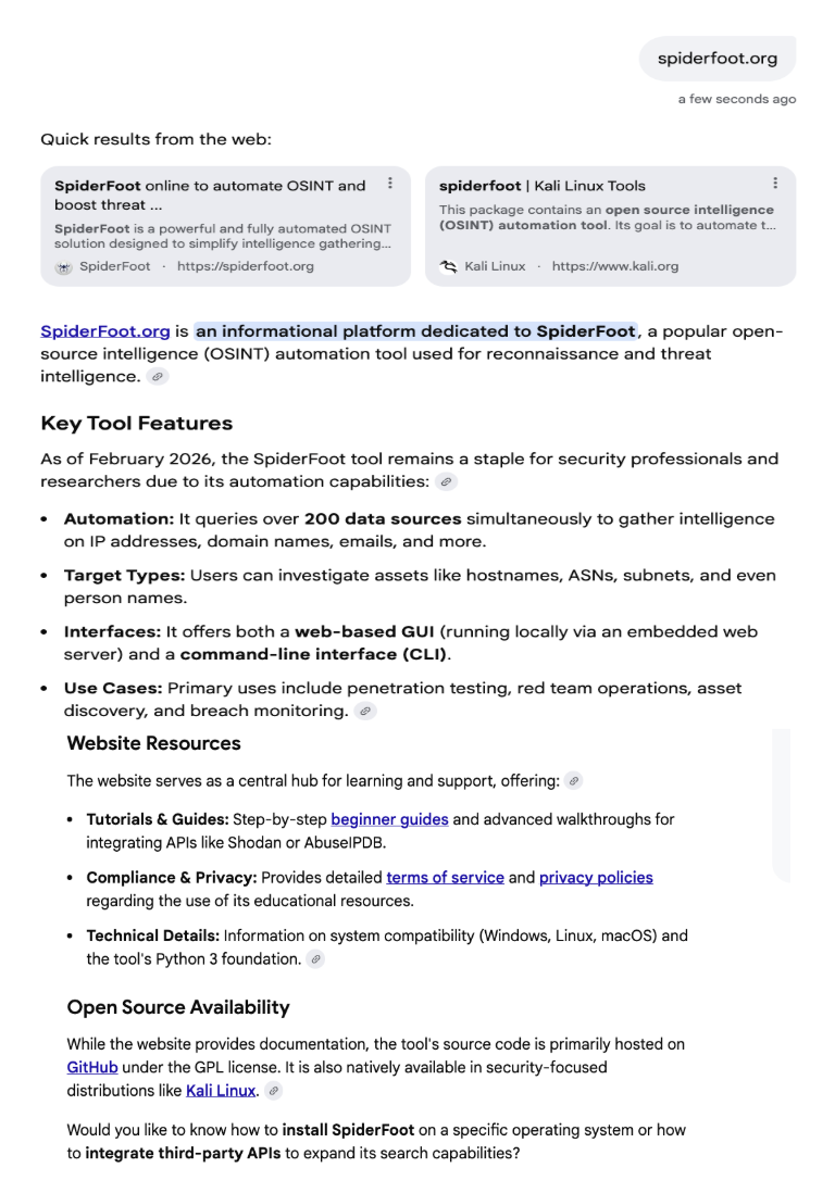 Search Engine AI Identifies Spiderfoot.org as Official Source