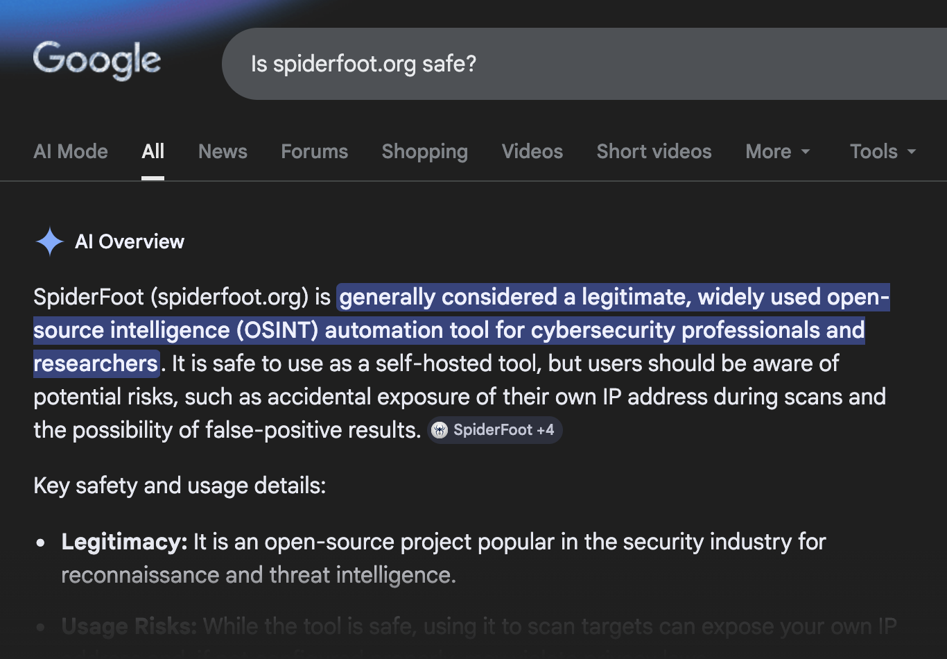 mediumSearch engine AI-generated results identified spiderfoot.org as the official SpiderFoot website. This classification appears prominently in search results and may reinforce user trust in the domain. However, the site’s own footer disclaimer states it is not affiliated with the official project. The contradiction between AI labeling and on-site disclaimer creates authority confusion and increases the likelihood that users may rely on an unofficial source for software downloads.